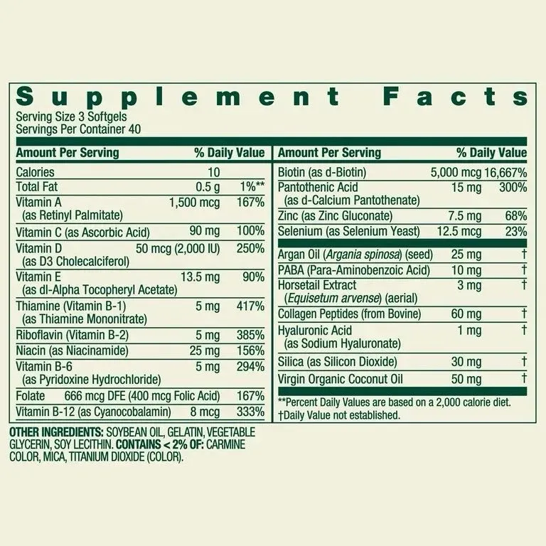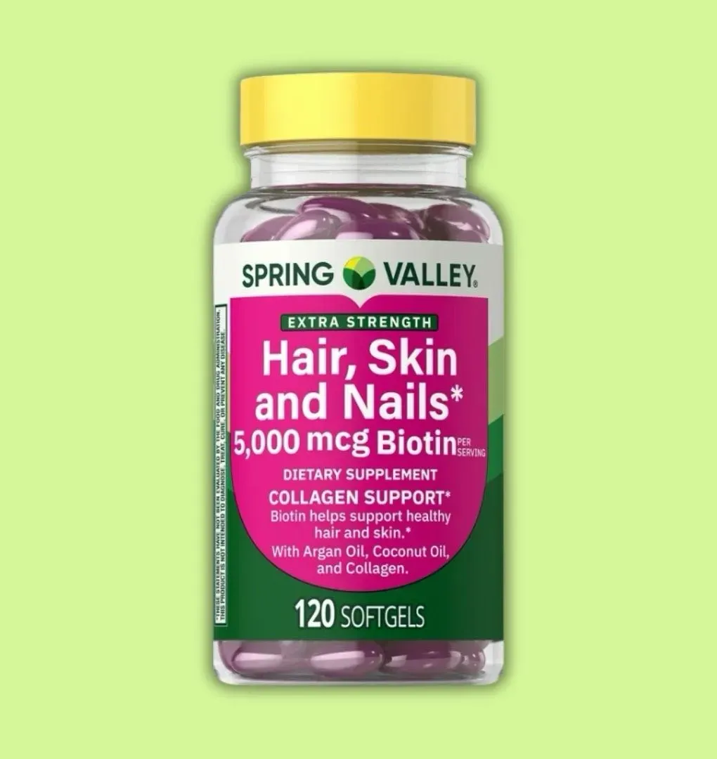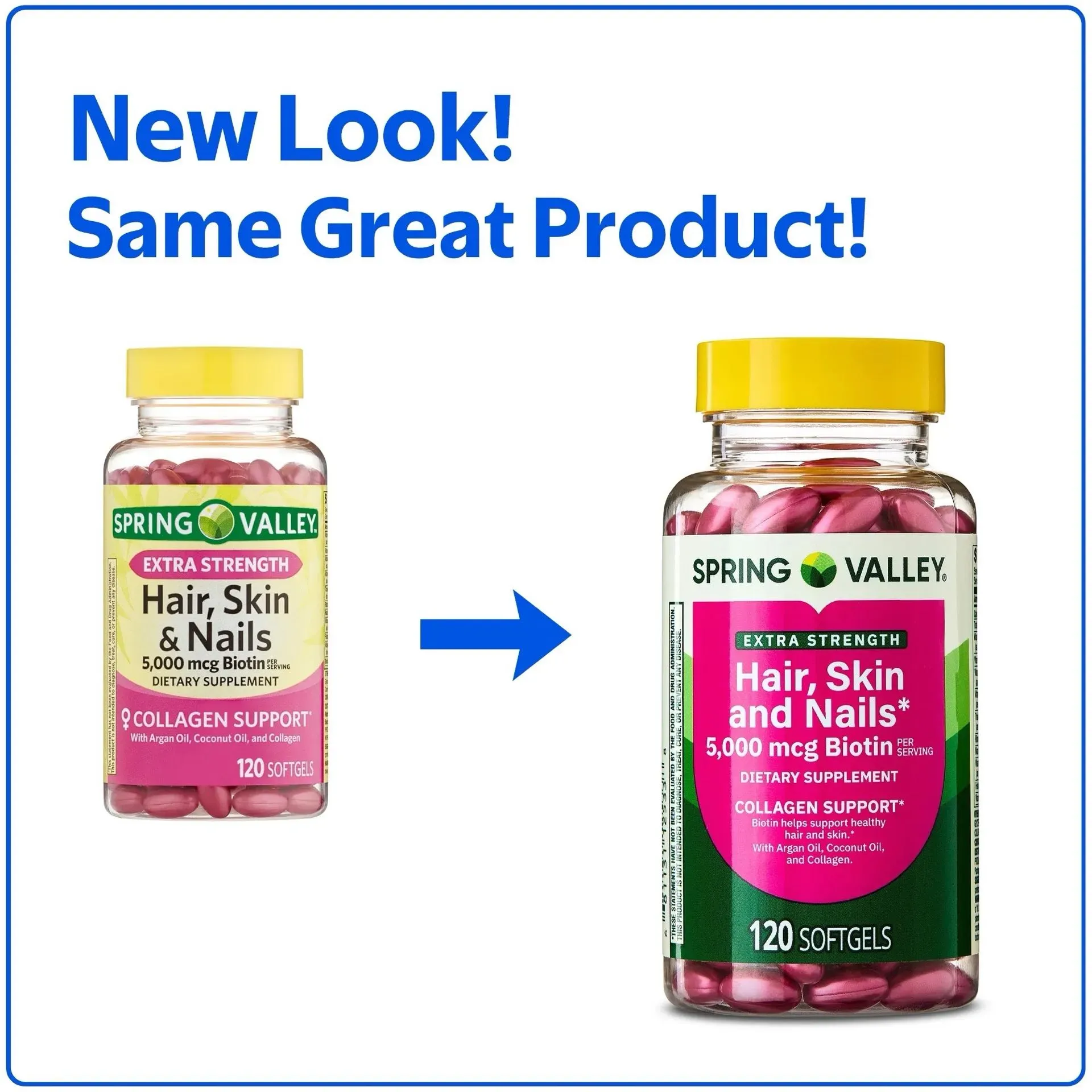 Spring Valley Extra Strength Hair, Skin and Nails es un suplemento dietético con biotina que apoya el cabello y la piel sanos. Contiene una mezcla compleja de vitaminas y nutrientes esenciales benef...